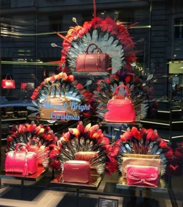 Pour la réalisation des vitrine de Noël de la marque Lancaster, Olinda a conçu sur-mesure des supports pour sacs en métal avec habillage métal finition miroir or et éventails miroir or gravés de motifs plumes.