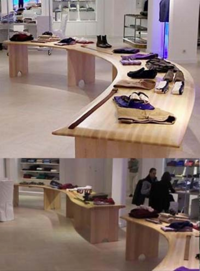 Le styliste de la marque voulait présenter ses produits de manière très originale avec des tables dessinées qui, assemblées pouvaient faire penser à des vagues. Les bords de tables devaient avoir une finition comme « une planche de surf ».