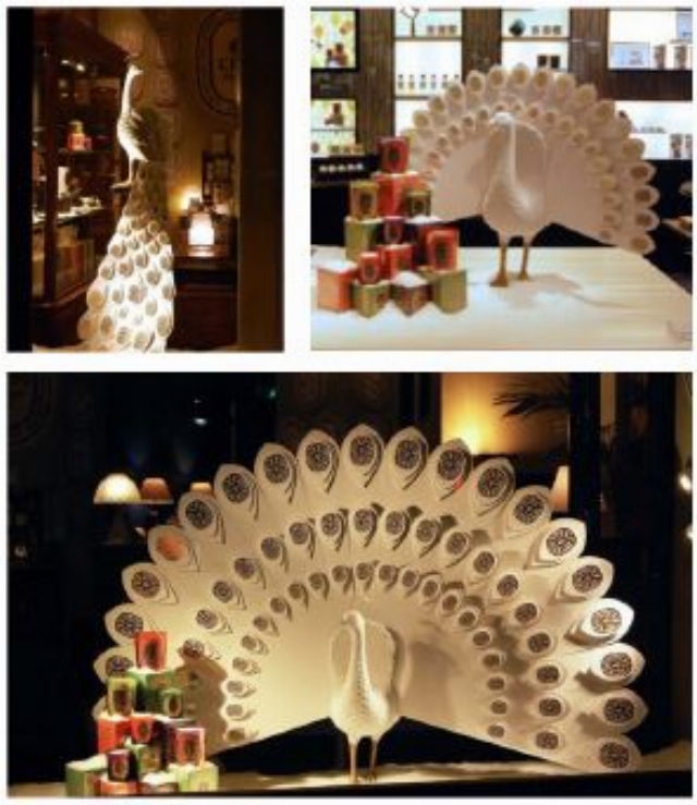 Création de paons décoratifs faisant la roue et de paons debout sur un perchoir pour les vitrines de Noël du réseau de boutiques Diptyque.