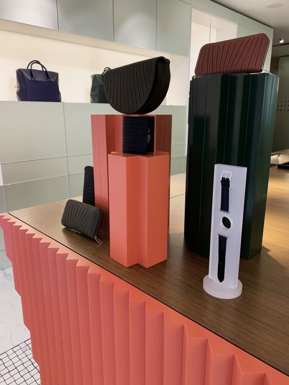 Réalisation de silhouettes en papier drop paper imprimé et rainuré Mise en place sur structures métal laquées Stèles en medium laqué
