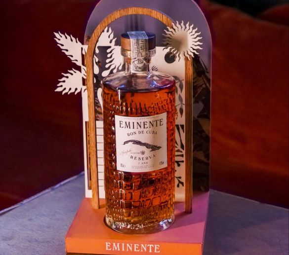 Multi-material display for Eminente rum bottle Forex base with hand-applied tadelakt Logos applied via transfer Oak laminate arch Chemical-cut brass visual + lacquering
